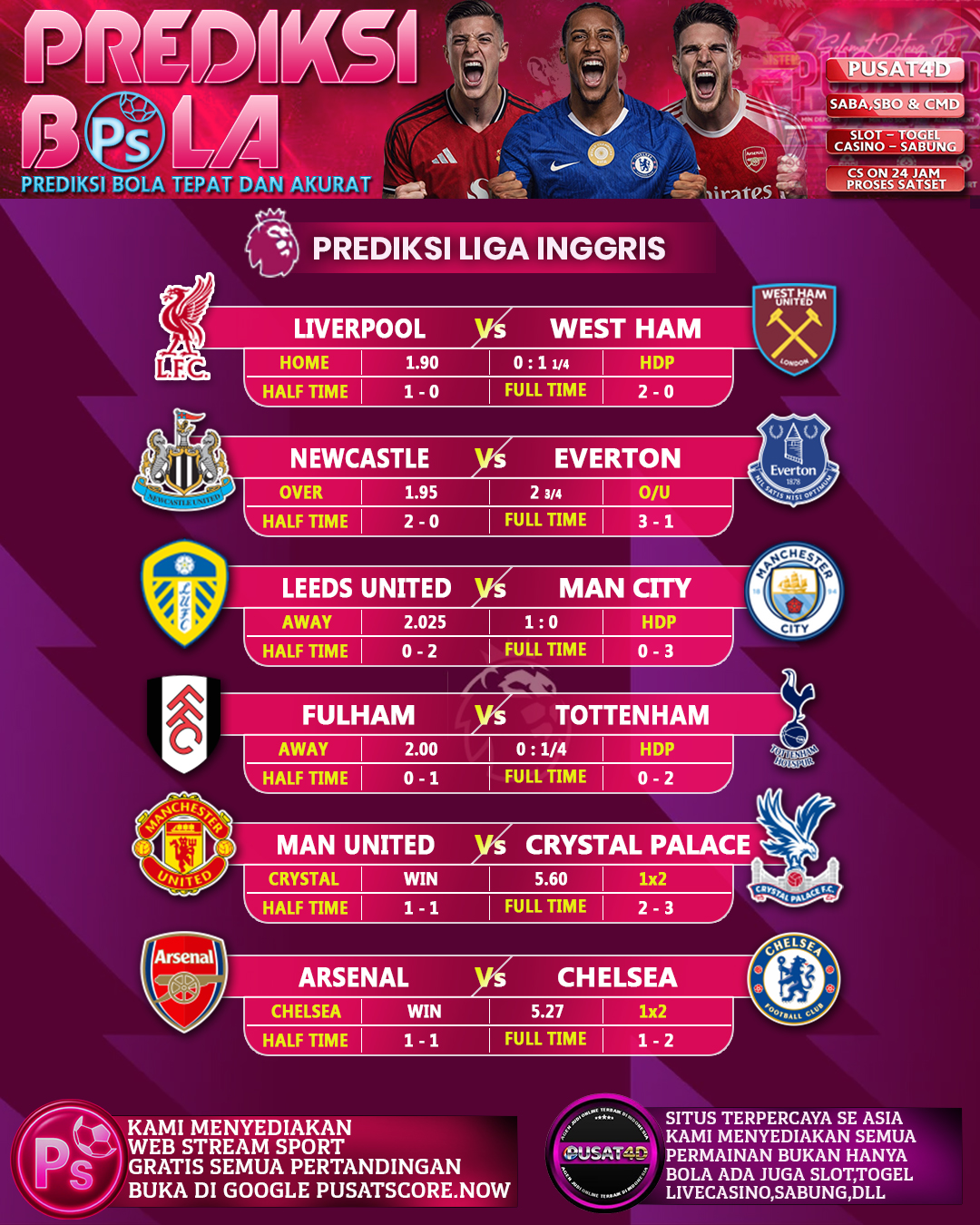 PREDIKSI LIGA INGGRIS TERAKURAT! JANGAN SAMPAI KETINGGALAN PASANG DAN MENANG BESAR DI PUSAT4D BERITA SEPUTAR BOLA :-https://t.me/PUSATSCORE-heylink.me/pusatscore 🎯 Main, nonton, dan menang bareng:👉 PUSAT4D👉 LIVE STREAM di heylink.me/pusatscore